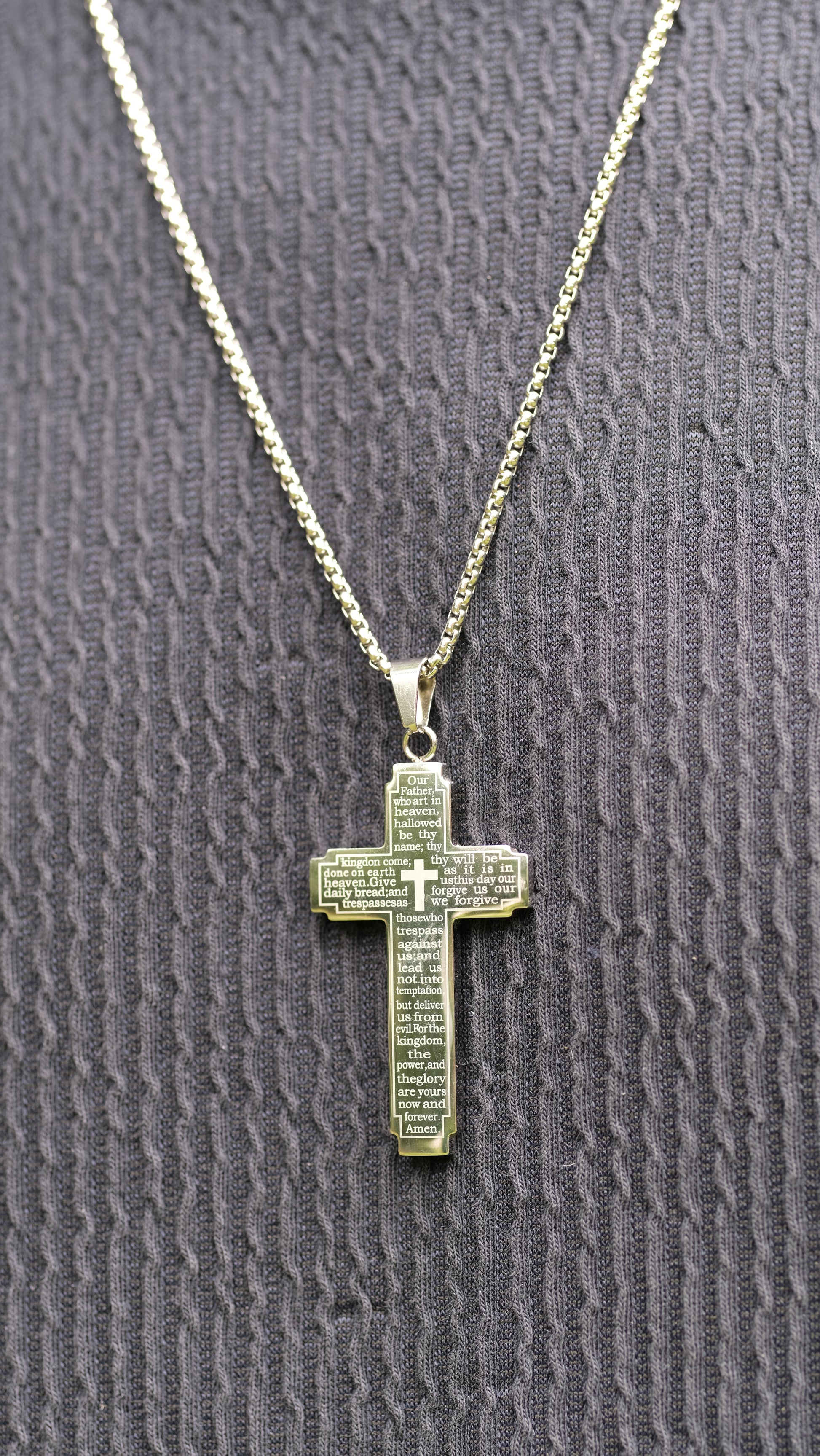 A beautifully crafted stainless-steel cross engraved with the full Lord’s Prayer. Subtle yet powerful—carry the Word of God close to your heart every day.