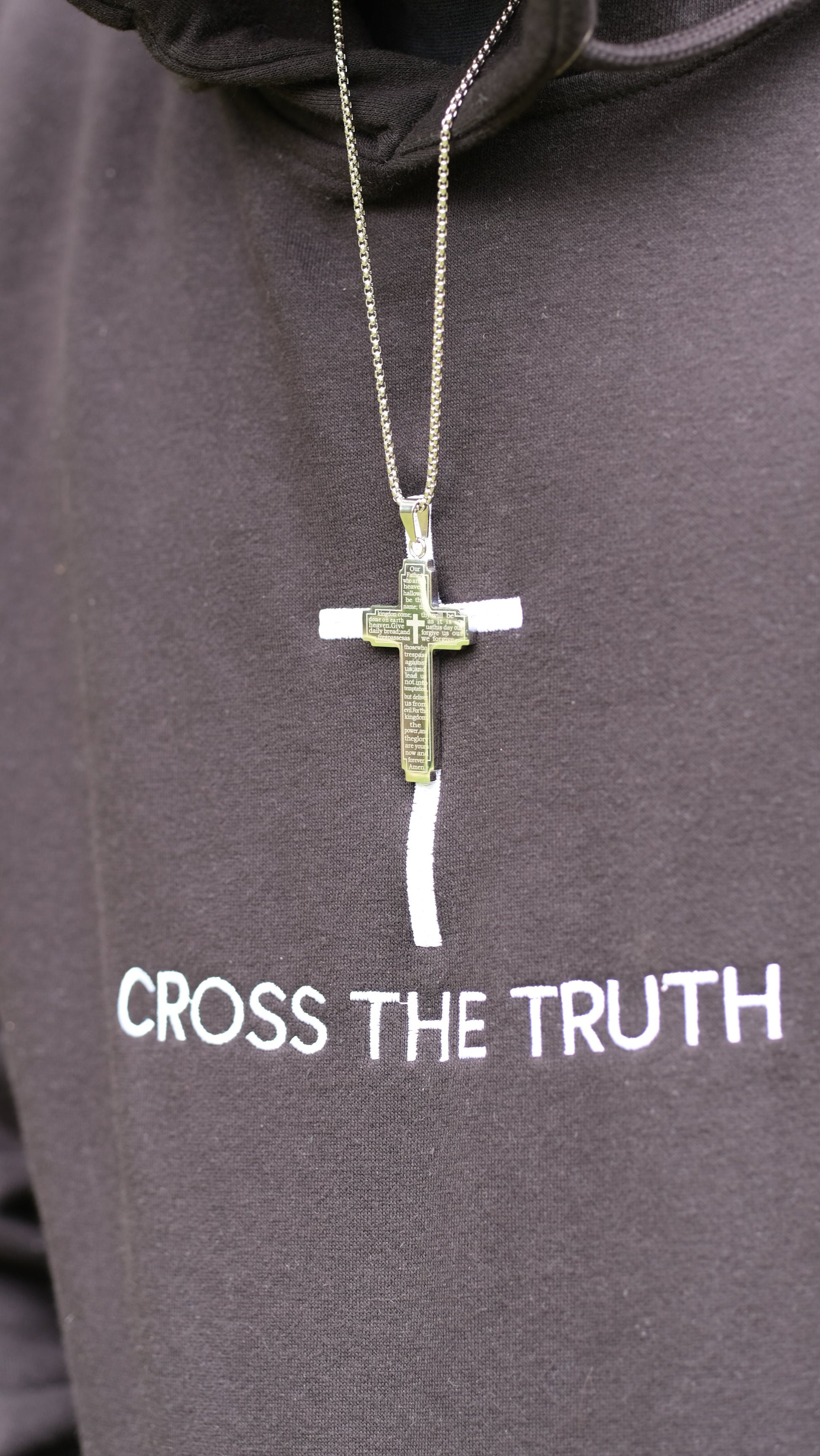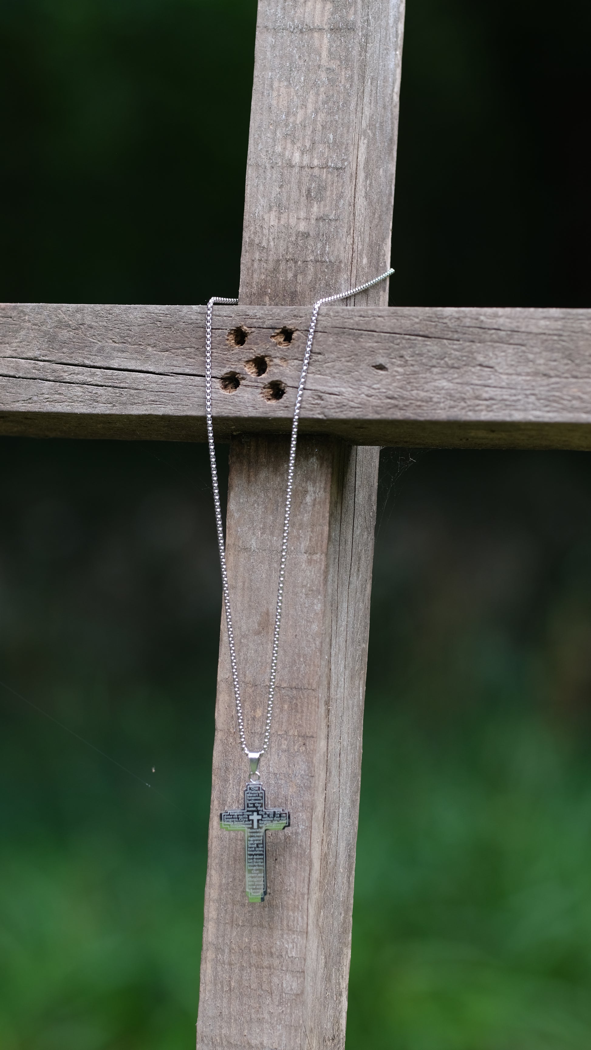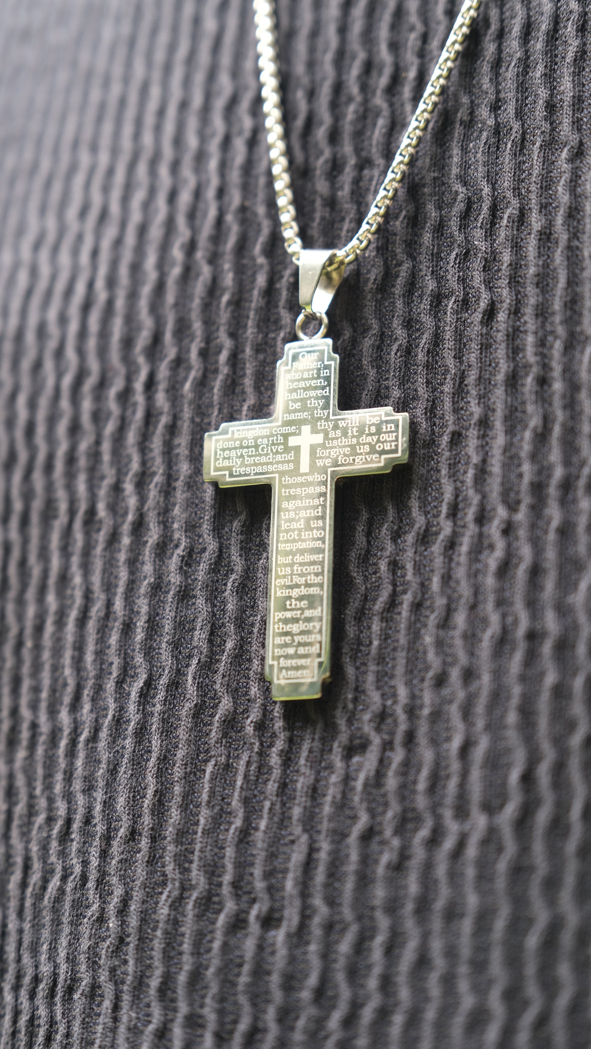 This bold stainless-steel cross pendant features the complete Lord’s Prayer engraved directly onto its surface — a daily reminder of strength, faith, and purpose. Designed in sleek black and silver tones, this piece speaks volumes without saying a word.